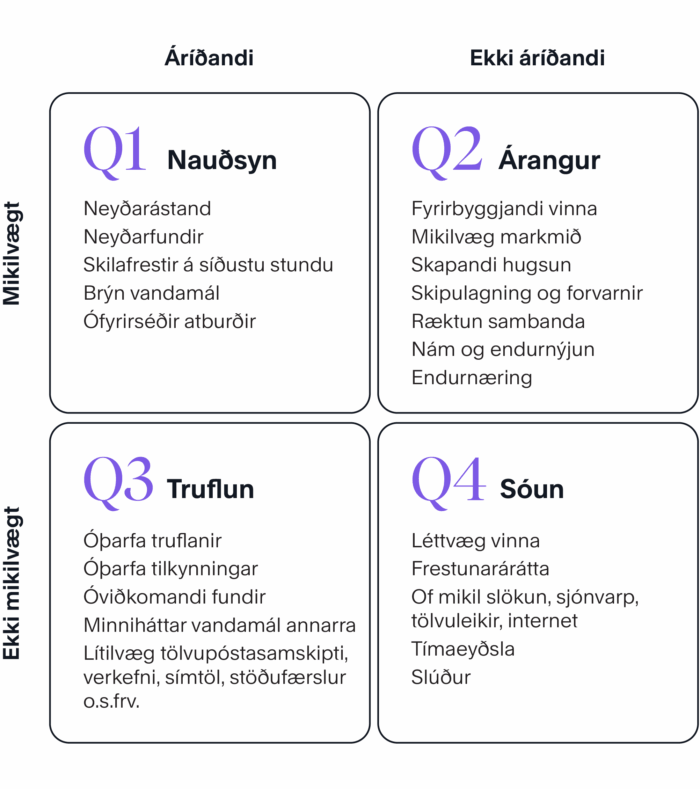 Við verjum tíma okkar í fjórum fjórðungum, sem skiptast í tvo þætti sem skilgreina athöfn: áríðandi og mikilvægt. Áríðandi merkir að það krefst óskiptrar athygli þinnar. Þeir hlutir sem eru áríðandi eru oftast sýnilegir. Sem dæmi má nefna er hringjandi sími áríðandi þáttur. Mikilvægir hlutir hafa hins vegar að gera með árangur. Þeir hafa áhrif á markmið okkar, gildi og mikilvægustu forgangsatriðin. Við bregðumst við áríðandi hlutum. Það sem er mikilvægt krefst meiri virkni og framleiðni.