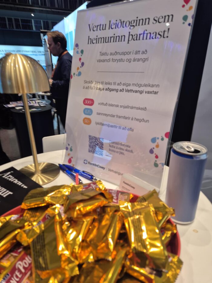 Á sýningarsvæðinu í Norðurljósasalnum tók FranklinCovey-teymið á móti gestum – þau Guðrún, Þóra, Kristinn og Auðbjörg – með hlýju, áhuga og gleði. Margir komu við á básnum okkar til að ræða um leiðtogafærni, starfsþróun, menningu og hvernig FranklinCovey getur stutt við fyrirtæki í að þróa bæði fólk og ferla.
